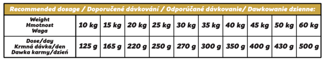 Krmivo se podává suché, svému psovi zabezpečte přístup k čerstvé vodě. Individuální nutriční potřeby závisí na faktorech, jako je věk, plemeno, aktivita a fyziologický stav. Ujistěte se, že je pytel po každém podávání správně uzavřen a skladujte ho na suchém a chladném místě mimo přímé sluneční světlo. Datum minimální trvanlivosti/šarže: viz obal.
