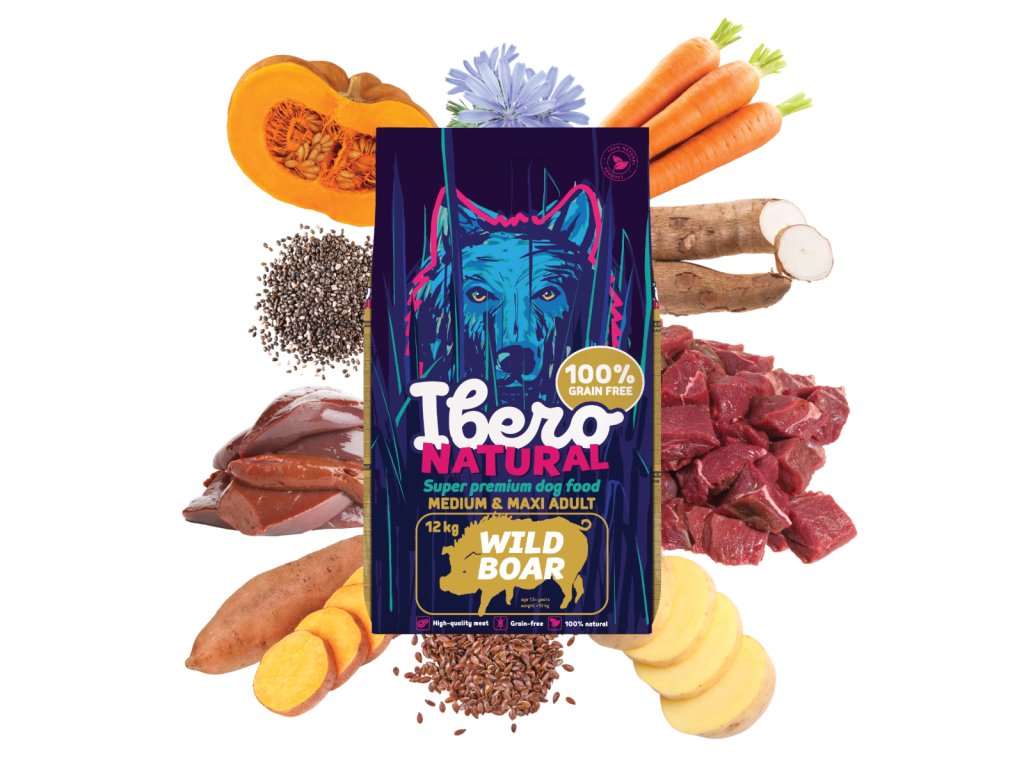 Ibero Grain-free Dog Medium & Maxi Adult Wild Boar je výživná a chutná receptura vytvořená pro dospělé psy středních a velkých plemen. Základ krmiva tvoří 29 % sušeného masa z divočáka, které se řadí mezi velmi kvalitní a přirozené zdroje proteinu. Divočák je bohatý na bílkoviny, má nízký alergenní potenciál a díky své výrazné chuti je ideální i pro vybíravé psy. Krmivo je doplněno o batáty, brambory, dýni a mrkev, které poskytují přirozené vitamíny, minerály, vlákninu a podporují zdravé trávení. Chia semínko, lněné semínko a čekankový extrakt přispívají k vitalitě, zdravému trávení a kvalitní srsti. Pro dlouhodobou podporu pohybového aparátu obsahuje receptura glukosamin, chondroitin a extrakt z chrupavek, které pomáhají chránit klouby a podporují jejich pružnost. Krmivo je 100% přírodní, bez GMO, umělých konzervantů a bez obilovin. Je vhodné pro dlouhodobé podávání jako hlavní zdroj kvalitní, funkční a chutné výživy.