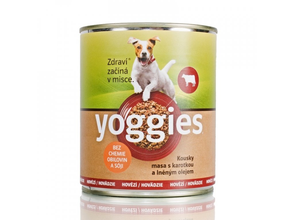 Konzerva Yoggies se špičkovým hovězím masem, čistou svalovinou, bez jakýchkoliv konzervantů a dochucovadel. Konzerva obsahuje výhradně kusy masa (větší i menší kousky), zeleninu (karotku) jako zdroj vlákniny, přírodní vývar z masa a kostí (žádný bujón) a také lněný olej.
